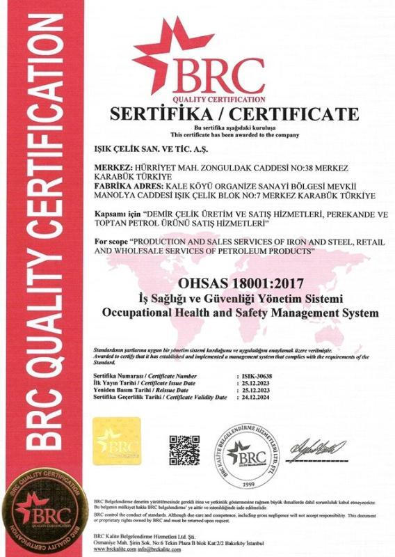 Our company IŞIK ÇELIK INDUSTRY AND TRADING INC., as a result of the on-going works that completed the management system in 2007, has been certified with ISO 9001 “Quality Management System“. In addition, our company has been entitled to receive the aforementioned certificate by completing ISO 14001 “Environmental Management System“, OHSAS 18001 “Occupational Health and Safety Management” and ISO 10002 “Customer Satisfaction Management System” processes within the framework of wholesale quality understanding.